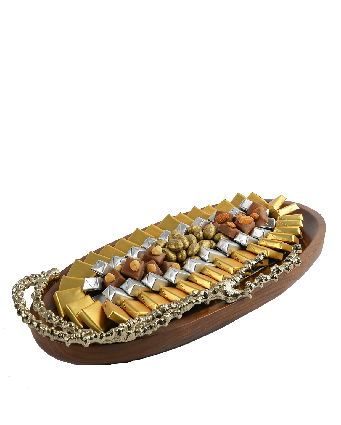 Plateau en bois et métal garni de chocolat