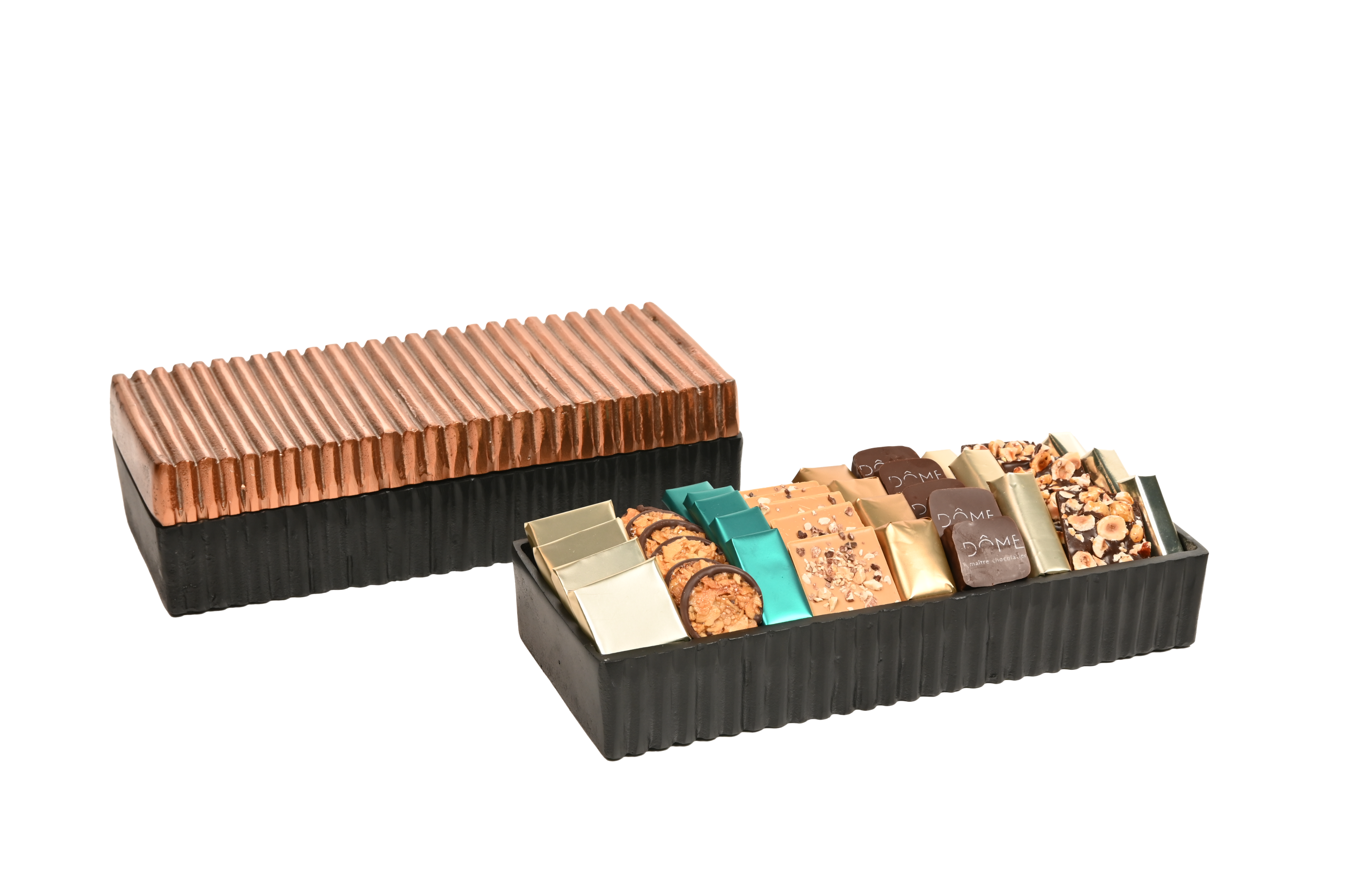 Boîte en aluminium cuivre et noir garnie de chocolat
