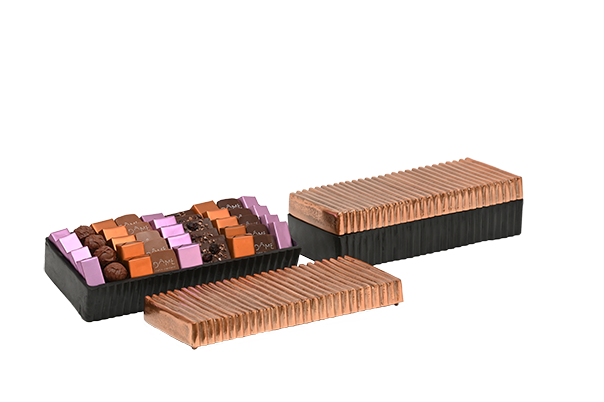 Boîte en aluminium cuivre et noir garnie de chocolat
