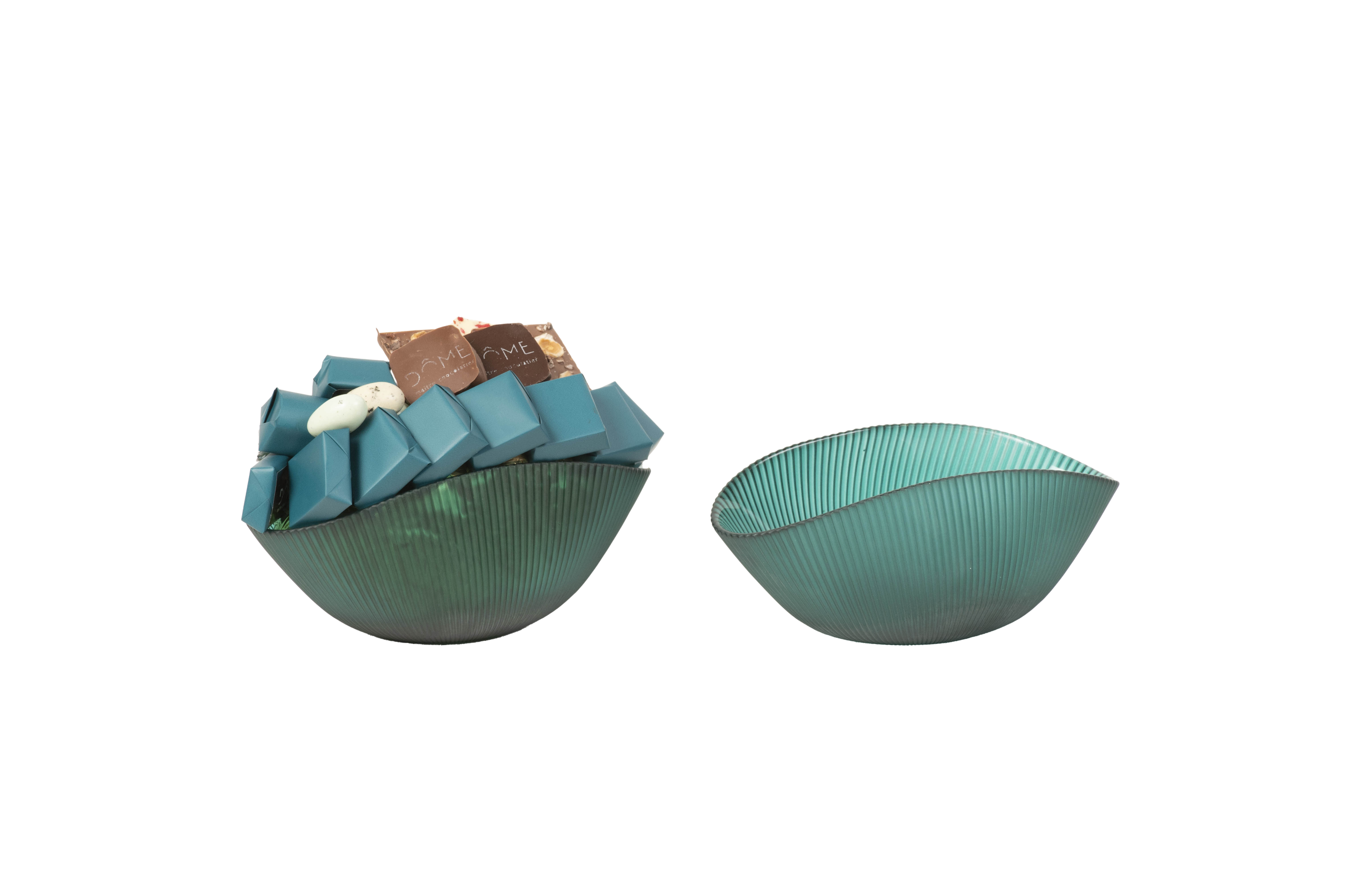 Coupe en verre couleur émeraude garnie de chocolat